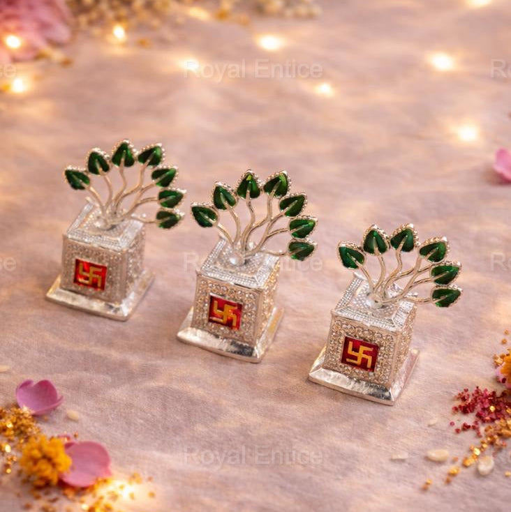 Invite prosperity, positivity, and divine blessings into every celebration with our Shubh German Silver Tulsi. Beautifully crafted with intricate silver detailing, this elegant piece features a sacred swastik symbol and a graceful green-leaf tree motif — symbolizing growth, harmony, and new beginnings.