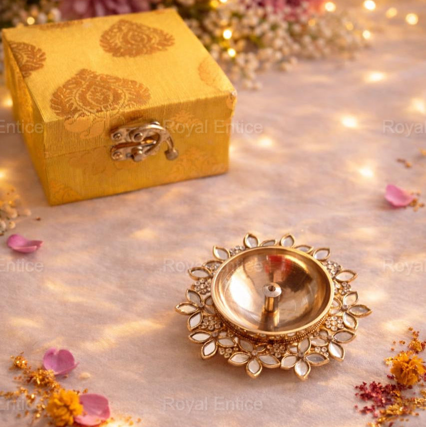 Beautifully crafted with intricate detailing, the diya symbolizes prosperity and new beginnings. Paired with a premium gift box, it becomes a perfect keepsake for your loved ones — blending tradition with luxury.